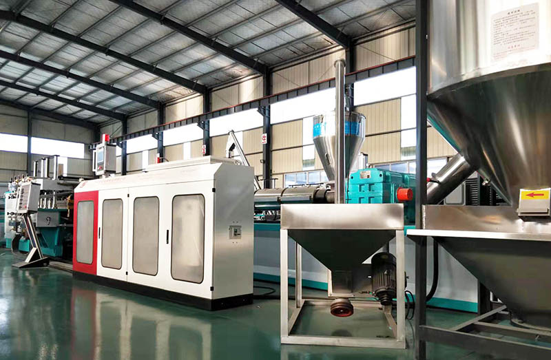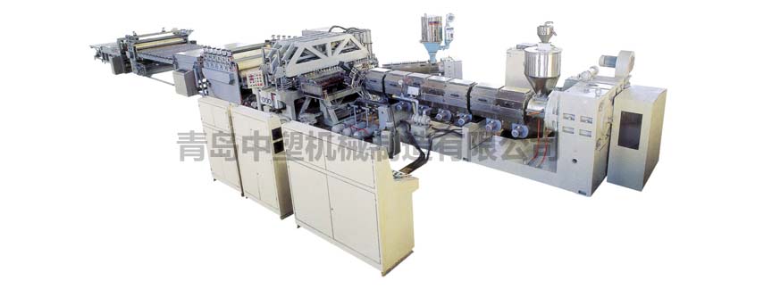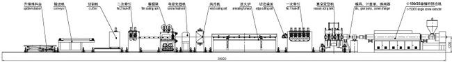 PC阳光板设备由挤出机、快速换网装置、模具、定型台、一次牵引机及切边装置、热烘箱、覆膜装置、二次牵引机、切割装置、输送机、料架等组成。中空板挤出线特备配备的定型机和退火炉,其特点如下:真空定型台的耐磨性、除尘性、定型性,使其更容易操作;高速螺杆,高旋转速度匹配减速泵和稳定压力的低能耗消耗;挤出量高于其他品牌的25%,原因是其定型板的特殊设计;定型板的冷却系统和真空系统的独特设计保证高速度的挤出定型;特殊的退火炉设计,相比其他品牌的挤出线更容易控制,板材的平整度;牵引辊的柔软度按客户的要求设计;中空板的空气容量和低压要进行调整并容易操作;特殊模块是由模具专门为PC阳光板设计的。产品的双壁厚度范围要在2mm到10mm之间。双壁之间的棱要成直角和对角线形状; 抗UV共挤层可以单面可以双面,根据结构要求外表层要进行喷砂处理或光滑处理。高比例可回收薄片可以和原材料混合一起。