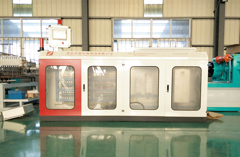 4. 真空定型台:定型系统中设有快速的热交换制冷系统。并于真空系统有效交错, 吮吸分布均匀合理, 此种分布确保了定型精度。真空系统由两个独立的子系统组成。每个子系统均配有多条三点式固定循环真空县, 每个固定循环均携带真空调节系统和真空显示系统,使板材表面的真空度均匀而稳定.
