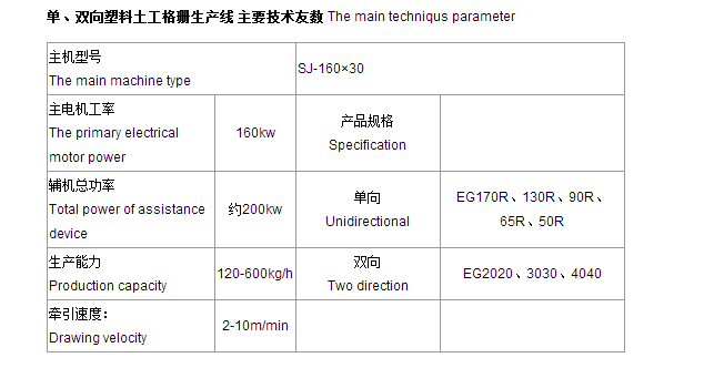我公司生产的GSB-Z塑料单、双向拉伸土工格栅机组是在吸收国外选进技术并结合本公司多年生产塑料板材设备经验基础上自行研制开发的最新产品,它主要用于生产各种规格的单、双向土工格栅。该格栅可广泛应用于高速公路、市政道貌路、铁路、飞机跑道等路基增强、公路、铁路,以及江河海河岸边的加筋土档墙的加筋工程;江河海坝的堤坝增强;以及果园、菜地、牲畜、工地等围栏。