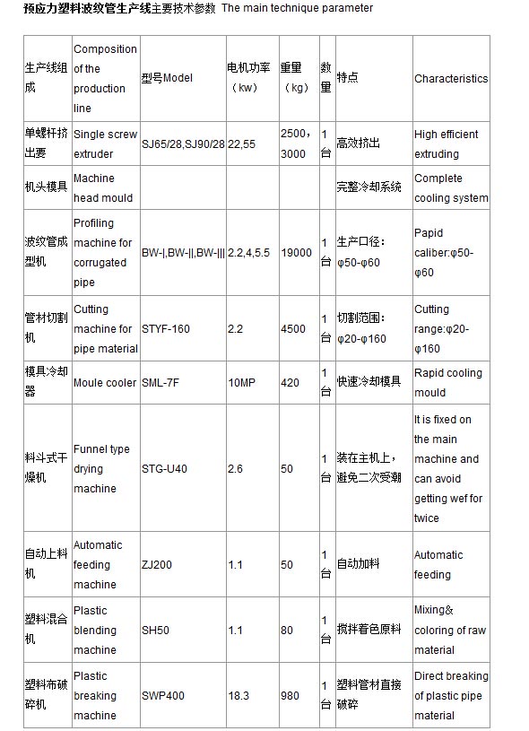 预应力单波纹管作为一种新型成孔材料,与金属波纹管相比,它具有不怕酸、碱腐蚀,密封性好,无渗水、漏浆,环刚度高,摩擦系数小,耐老化,抗电腐蚀,柔软韧性好,不易被捣棒凿破,施工连接方便等优点,解决了传统金属波纹管的所有弊端。该管材最初是从国外引进的,价格高,供货时间长。针对次现状,青岛中塑料机械制造有限公司在积极消化吸收进口设备的基础上,依靠科研院校,研制开发并生产了以HDPE预应力单壁波纹管为主的管材生产线。生产规格从φ50mm-φ160mm。该项目填补了国内空白,无疑会对预应力单壁波纹管管材的推广及应用超到良好的推动作用,也会给制品生产商带来丰厚的利润。