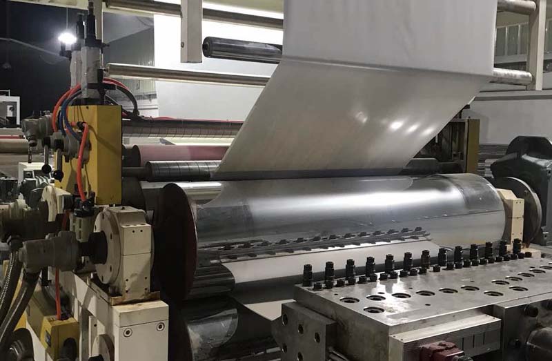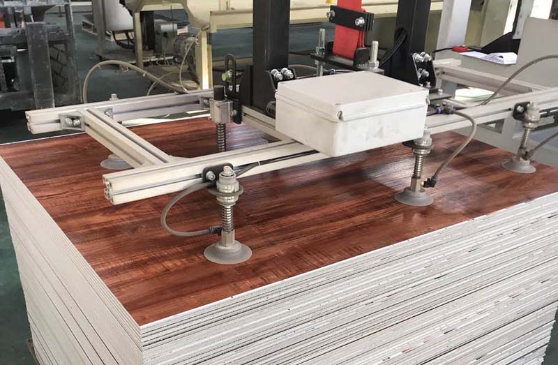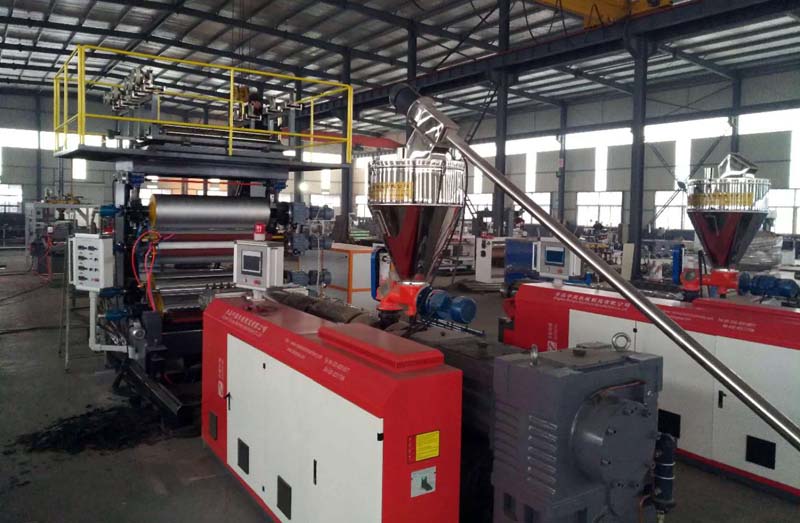 PVC石塑地板四辊加一辊生产线设备,挤出基材,热敷彩膜装饰层和耐磨层,实现一步法,在同一台设备上同时完成。第一,表面可热敷上各种不同颜色的彩膜装饰层;第二,可直接在板材装饰层上热敷耐磨层;第三,可直接做上各种各样浮雕木纹及各式各样的花纹;第四,底层软垫消音层,也可直接热敷上去。以上四条均可同时在一条生产设备上完成多层结合为一体。可减少表层处理花纹,耐磨的设备。减少人工及设备的投资,大大降低PVC地板生产成本。